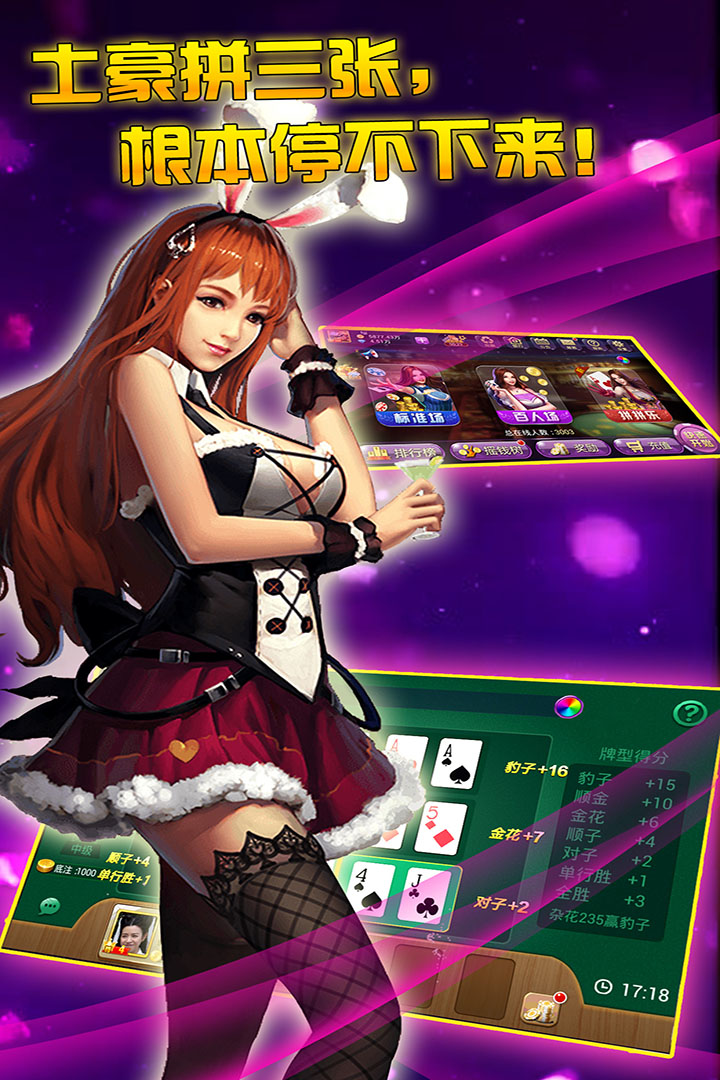 2.標準打法,換牌打法,悶牌打法,各種玩法應有盡有。時下最流行的贈送可愛禮物、搞笑對話、炫酷表情。遊戲交友兩不誤,全民歡樂不停!